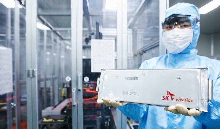 [서울=뉴시스]SK 배터리를 들고 있는 연구원 (사진=SK이노베이션 제공) *재판매 및 DB 금지