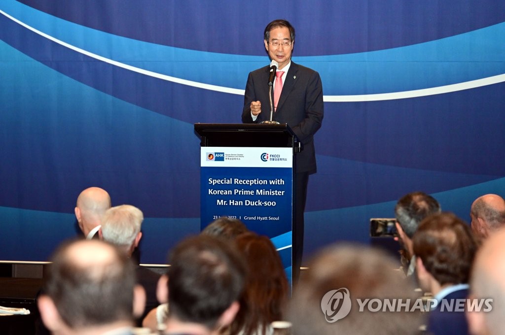 (서울=연합뉴스) 한덕수 국무총리가 23일 저녁 서울 용산구 그랜드하얏트서울에서 열린 한독상의·한불상의 공동만찬에 참석해 발언하고 있다. 2022.6.23 [총리실 제공. 재판매 및 DB 금지] photo@yna.co.kr