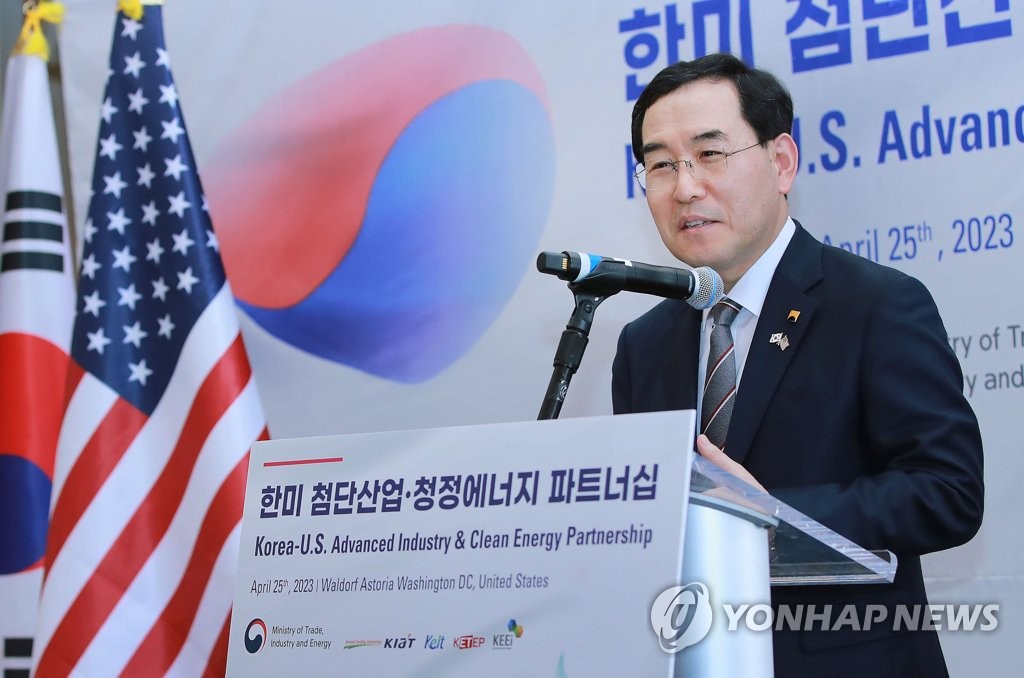 (서울=연합뉴스) 이창양 산업통상자원부 장관이 25일(현지시간) 미국 워싱턴 D.C. 왈도프 아스토리아호텔에서 열린 '한미 첨단산업·청정에너지 파트너십 MOU 체결식'에 참석해 인사말하고 있다. 2023.4.26 [산업통상자원부 제공. 재판매 및 DB 금지] photo@yna.co.kr