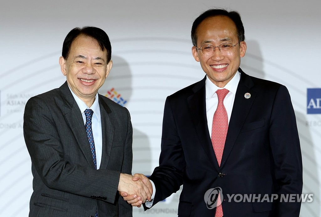 악수하는 추경호 경제부총리와 아사카와 마사츠구 ADB 총재