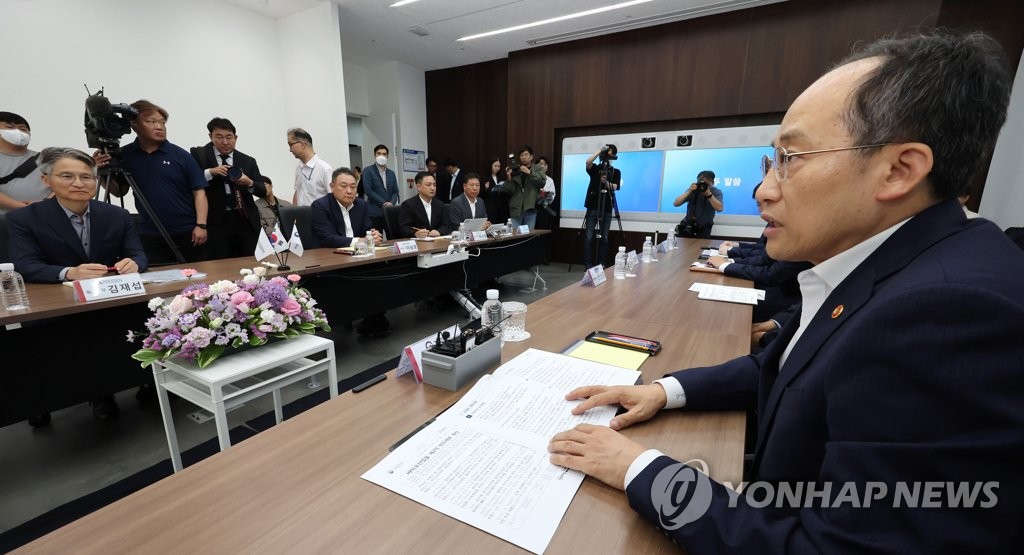 (청주=연합뉴스) 김주형 기자 = 추경호 경제부총리 겸 기획재정부 장관(오른쪽)이 바이오 산업 현장방문으로 24일 오후 충북 청주시에 있는 에이프로젠바이오로직스를 찾아 임직원들과 간담회 하고 있다. 2023.5.24 kjhpress@yna.co.kr