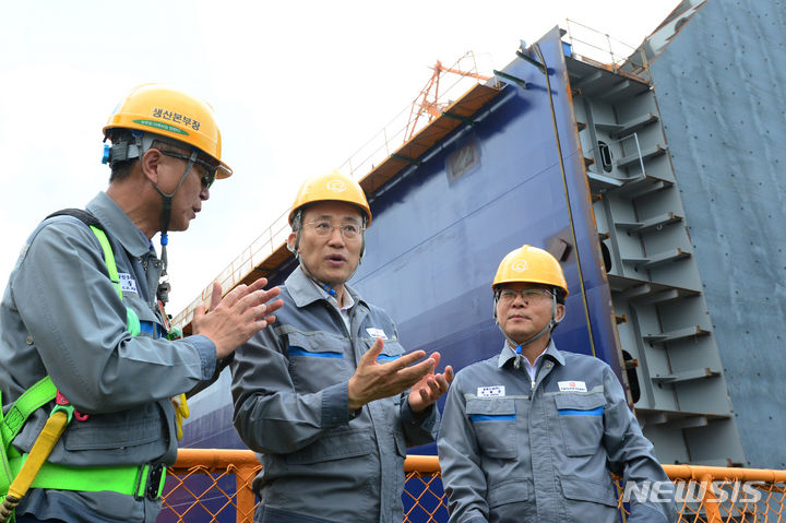추 부총리는 초대형 선박을 4척까지 건조할 수 있는 세계 최대 규모인 제1 도크를 직접 둘러본 이후 간담회를 진행했다.