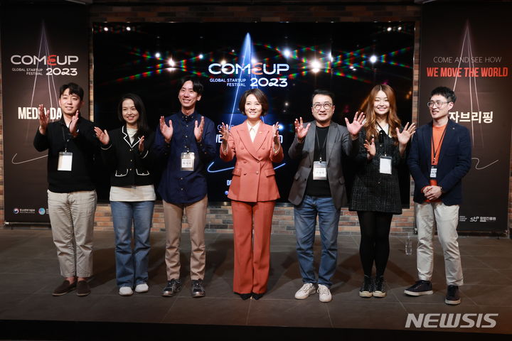 [서울=뉴시스] 이영 중소벤처기업부 장관(가운데)이 30일 30일 서울 서초구 드림플러스에서 열린 '컴업 2023 기자 브리핑'에서 박재욱 코리아스타트업포럼 의장(왼쪽에서 세 번째) 및 참석자들과 기념 촬영을 하고 있다. (사진=중소벤처기업부 제공) 2023.10.30. photo@newsis.com