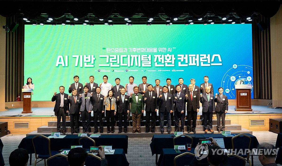 (서울=연합뉴스) 29일 서울 강남구 한국과학기술회관에서 열린 'AI 기반 그린디지털 전환 컨퍼런스'에서 참석자들이 기념 촬영을 하고 있다. 앞줄 왼쪽 여섯 번째부터 이종호 과학기술정보통신부 장관, 김상협 탄소중립녹색성장위원회 위원장, 고진 디지털플랫폼정부위원회 위원장, 구자균 한국산업기술진흥협회장. 2024.4.29 [과학기술정보통신부 제공. 재판매 및 DB 금지] photo@yna.co.kr