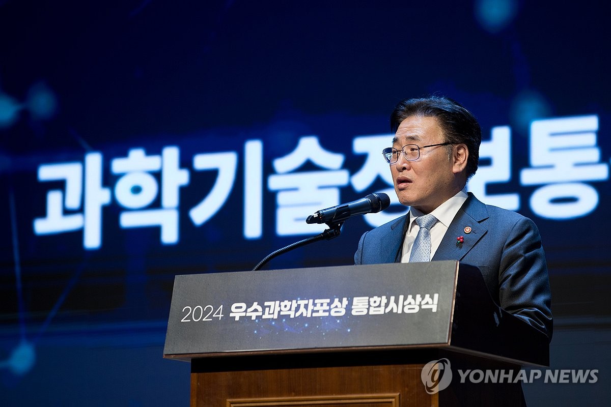(서울=연합뉴스) 유상임 과학기술정보통신부 장관이 12일 서울 강남구 한국과학기술회관에서 열린 '2024 우수과학자포상 시상식'에서 축사하고 있다. 2024.12.12 [과학기술정보통신부 제공. 재판매 및 DB 금지] photo@yna.co.kr