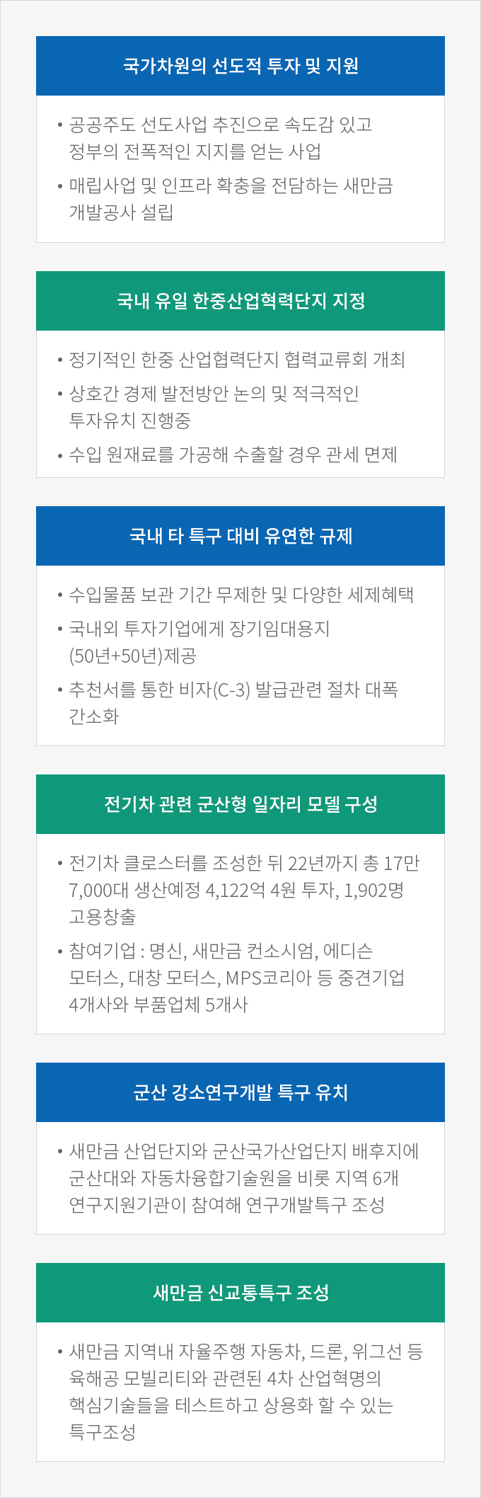 새만금 지역내 자율주행 자동차, 드론, 위그선 등 육해공 모빌리티와 관련된 4차 산업혁명의 핵심기술들을 테스트하고 상용화 할 수 있는 특구조성