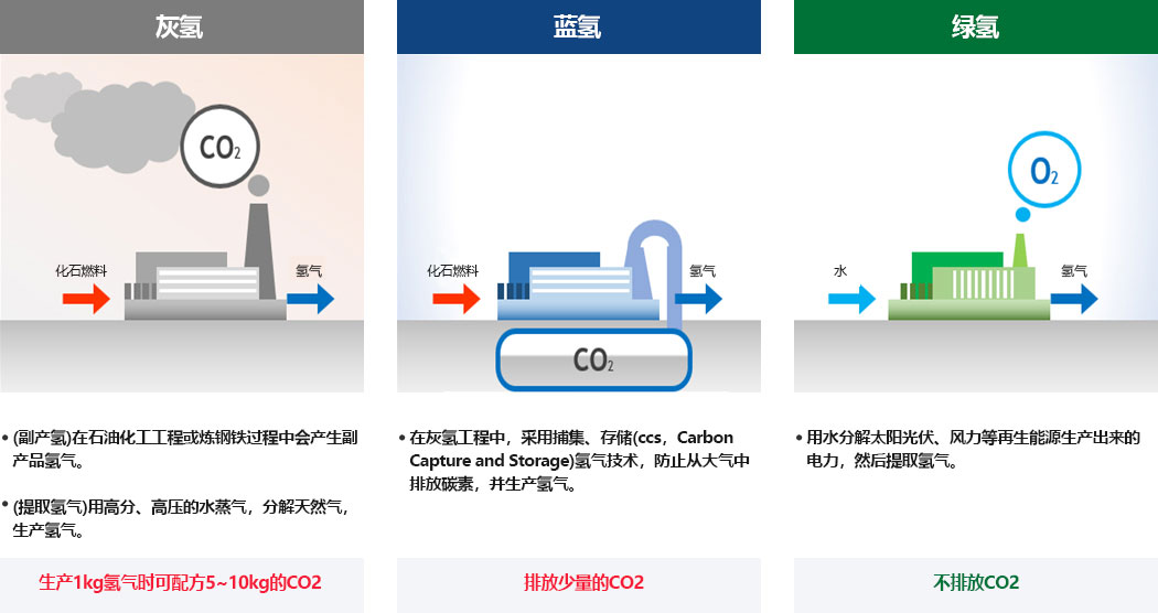 - (水电解氢气)指通过对水施加电流提取的氢气,由于利用太阳能、风能、水能等可再生能源的剩余电力,因此不会产生二氧化碳,也称为“绿色氢气”。